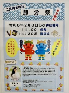 二見興玉神社 節分祭にて涼恵が福娘としてゲスト参加します! 令和8年2月3日(火) 14:00 節分祭斎行 祭典後撤豆式(14:40頃)祭典に伴う御祈祷停止 午後1時頃~祭典後(午後3時過ぎまで)祭典後、舞台に赤鬼青鬼が […]